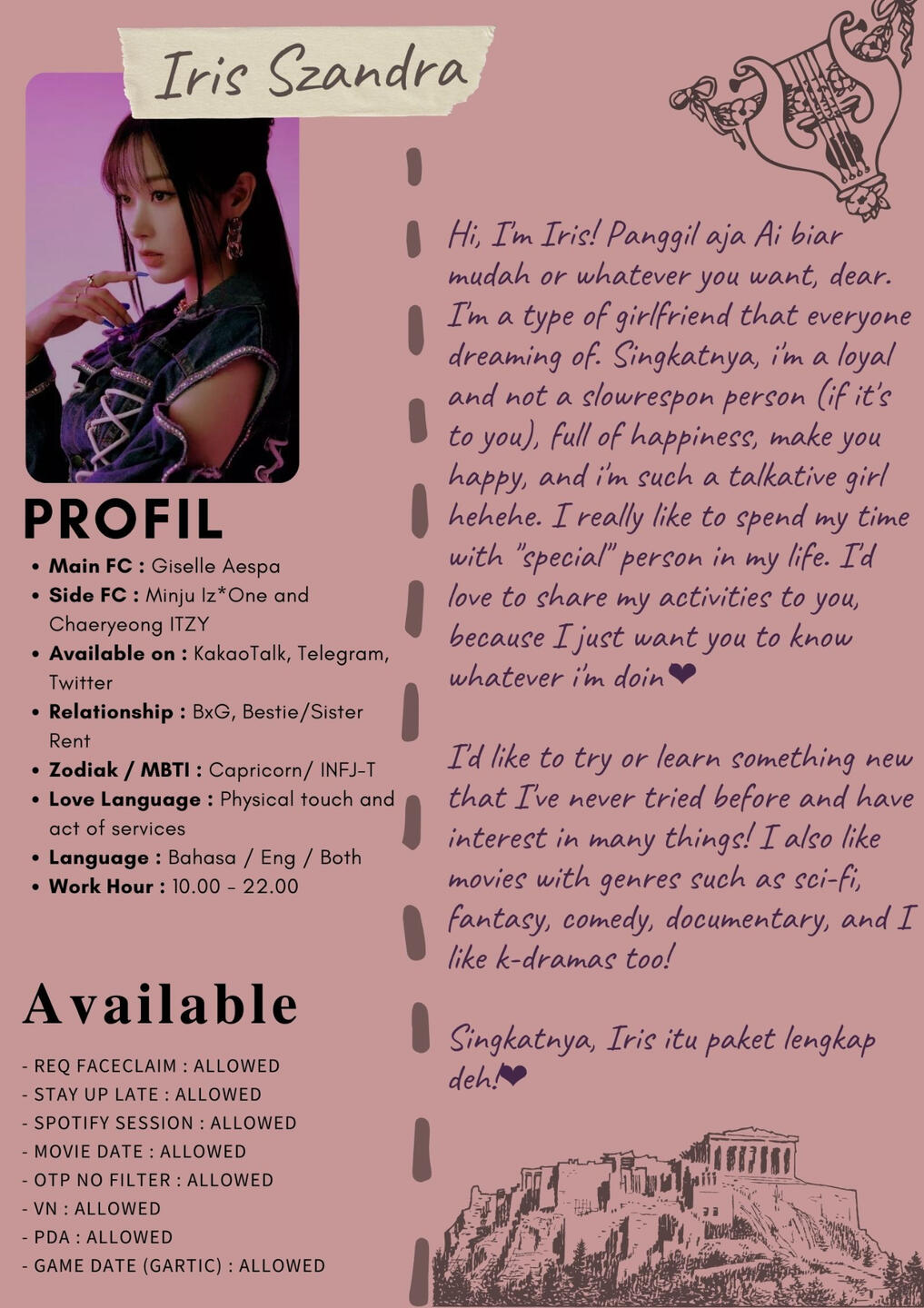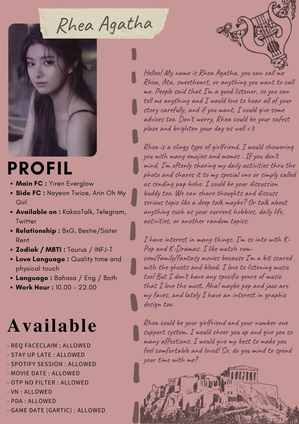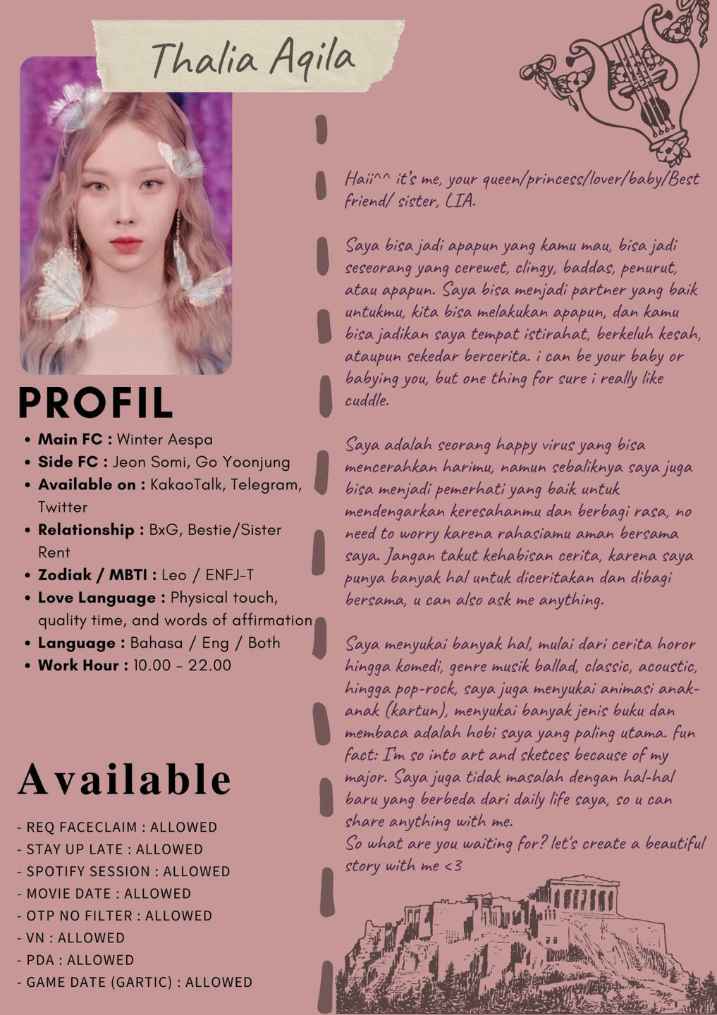include face claim req, pet name req, typing req, affections, free sposess/rent, only take 1 cust. (13k/day)